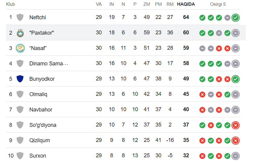 Ўзбекистон Суперлигасида совринли ўринлар учун курашаётган «Пахтакор», «Насаф» ва «Динамо» бугун сўнгги 30-тур ўйинларини ўтказди.