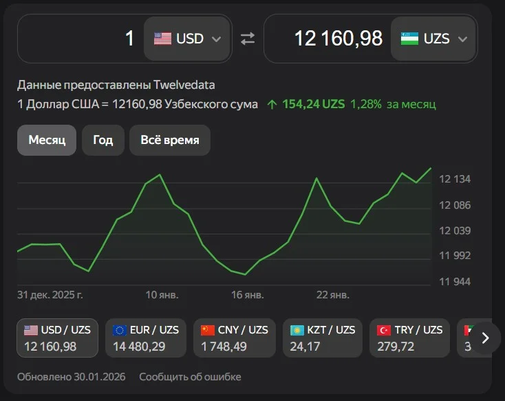 Ўзбекистонда 30 январь куни интернет қидирувларида энг кўп қизиқиш уйғотган мавзу — доллар курси бўлди. Google Trend маълумотларига кўра, “курс доллара” ибораси 20 мингдан ортиқ изланиш билан абсолют етакчига айланган. Унга яқин вақтда “kurs dollar”, “dollar kurs”, “доллар курси” каби турли тиллардаги вариантлар ҳам оммалашди. Бу ҳолат аҳоли ва бизнес учун валютанинг кундалик ҳаётдаги аҳамиятини яна бир бор кўрсатди.