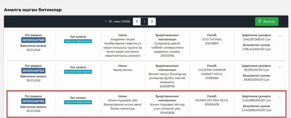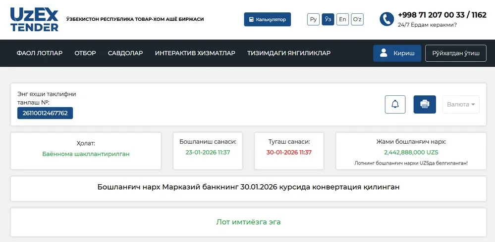 Лот рақами 26110012467762 бўлган ушбу харидда бошланғич нарх 2,442,888,000 сўм этиб белгиланган. Ғолиб компания эса 2,412,888,000 сўм таклиф қилган. Орадаги фарқ атиги 30 миллион сўм ёки 1,2 фоизни ташкил этади. Давлат харидларида бундай рамзий чегирмалар одатда ҳақиқий рақобат бўлмаганда ёки иштирокчилар ўзаро келишиб олганда кузатилади.