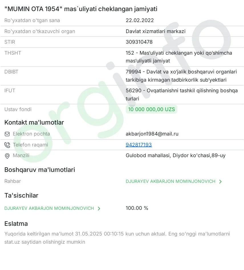 «MUMIN OTA 1954» МЧЖ 2022 йил феврал ойида, бор-йўғи 10 миллион сўмлик устав фонди билан ташкил этилган. Самарқанд вилояти Тайлоқ туманидаги оддийгина хонадонда рўйхатдан ўтган ушбу кичик корхона қисқа вақт ичида Жиззах ва Самарқанддаги тиббиёт муассасаларининг «алмаштириб бўлмас» ҳамкорига айланди.