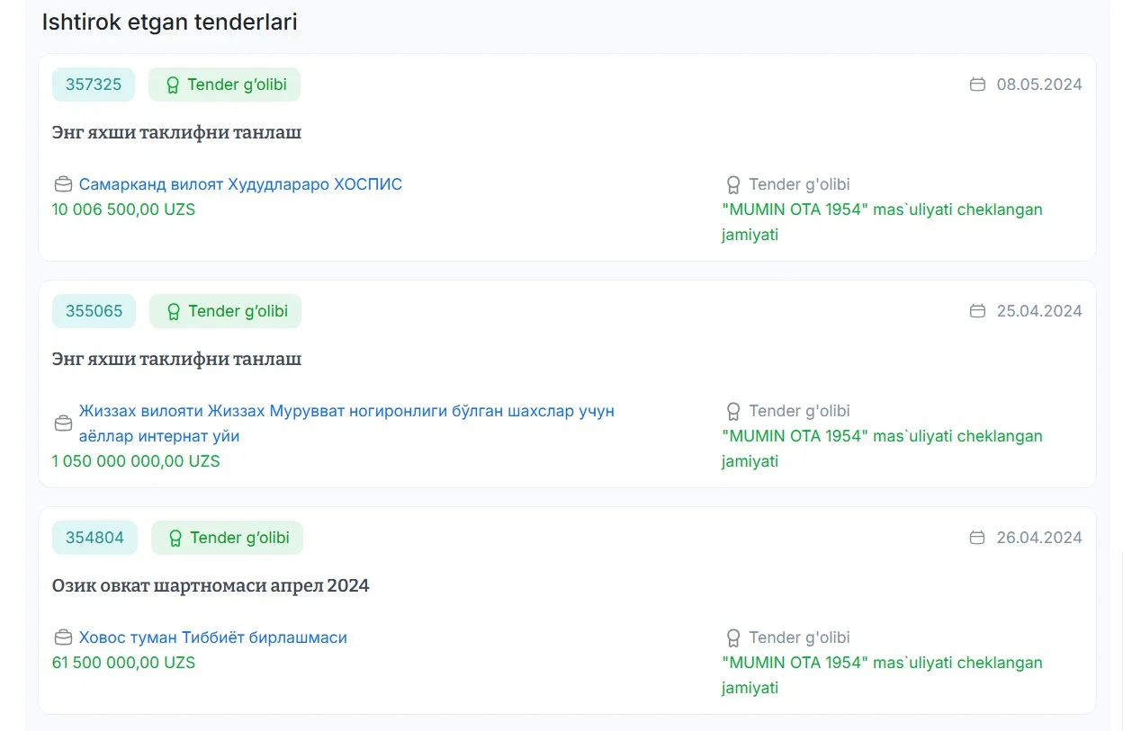Зомин «Мурувват» аёллар учун интернат уйидаги беморларни иссиқ овкат билан таъминлаш бўйича ўтказилган 2,4 миллиард сўмлик тендер якунланди. 2026 йил 30 январ куни эълон қилинган баённомага кўра, Самарқанднинг Тайлоқ туманида рўйхатдан ўтган «MUMIN OTA 1954» МЧЖ ғолиб деб топилди. Ижтимоий ҳимояга энг муҳтож қатламнинг дастурхони билан боғлиқ ушбу харидда бор-йўғи икки иштирокчи қатнашгани ва ғолибнинг Самарқанддан Жиззахга «кенгайиши» тизимда рақобат ўрнини таниш-билишчилик ёки монополлашган схемалар эгаллаб олмаяптими, деган кескин саволни ўртага ташлайди.