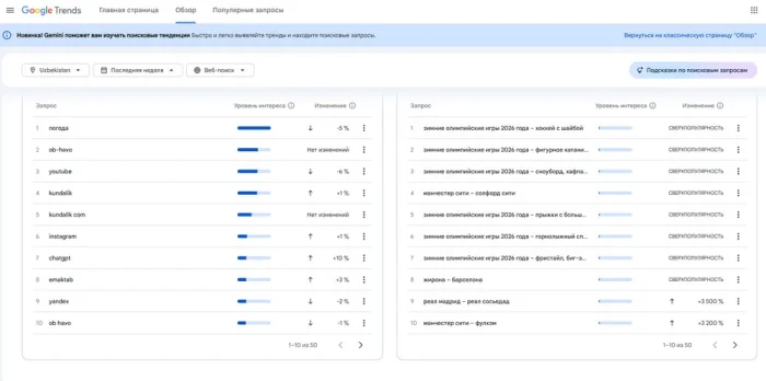 Google Trends тақдим этган охирги етти кунлик (2026 йил 10–17 февраль) ҳисоботга кўра, Ўзбекистонда «зимние олимпийские игры 2026 года – фристайл, биг-эйр, мужчины, результаты» сўрови «Breakout» (кескин ўсиш) даражасига чиққан. Бундан ташқари, хоккей, фигурали учиш ва сноуборд йўналишлари ҳам топ-сўровлар қаторидан жой олди.
