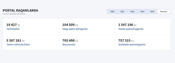 Ушбу рақамлар шуни англатадики, ҳар бир иш ўрни учун ўртача 51 нафар номзод даъвогарлик қилмоқда. Бироқ, суҳбат босқичига етиб келганлар сони (757 302 нафар) жами иштирокчиларнинг фақат 14 фоизини ташкил этади. Бу номзодларнинг сараланиш жараёнида нафақат билим, балки малакавий талабларга мос келиши ҳам қаттиқ назорат қилинаётганидан далолат беради.