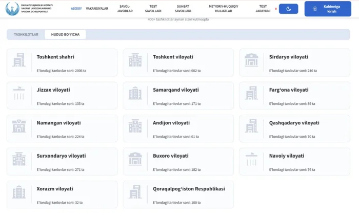 Ўзбекистонда давлат фуқаролик хизматига қабул қилишнинг ягона очиқ портали — vacancy.argos.uz орқали эълон берган ташкилотлар сони жами 19 427 тага етди. Портал маълумотларига кўра, тизим ишга тушгандан буён 104 мингдан ортиқ фуқаро очиқ танловлар асосида ишга қабул қилинган бўлса-да, ҳудудий номутаносиблик ва танлов иштирокчиларининг фаоллигида катта фарқлар кузатилмоқда. Масалан, Тошкент шаҳрида 2006 та фаол вакансия мавжуд бўлган бир пайтда, Жиззах вилоятида бу кўрсаткич 135 тани ташкил этмоқда. Бу рақамлар давлат бошқарувида кадрлар селекцияси рақамлашганини кўрсатса-да, чекка ҳудудлардаги вакансиялар учун рақобат даражаси ҳамон марказдан сезиларли даражада пастлигича қолмоқда.