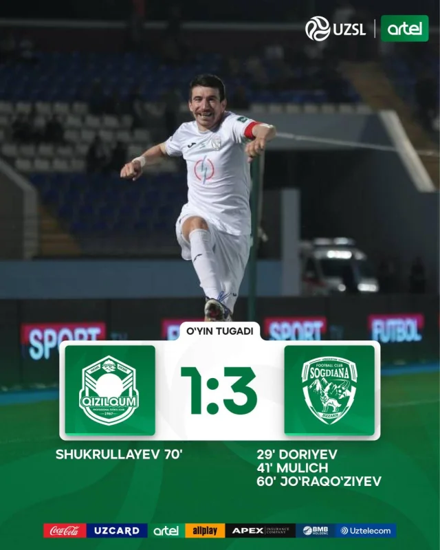 "Қизилқум"га қарши учрашув "Сўғдиёна" учун нафақат очко, балки руҳий ишончни тиклаш вазифасини бажарди. Ўйиннинг 29-дақиқасида Люпчо Дориевнинг голи ва 41-дақиқада Фейсал Муличнинг жавоб тўпи меҳмонларнинг қарши ҳужумдаги тактик интизомини кўрсатиб берди.