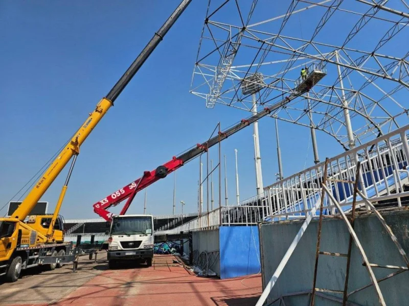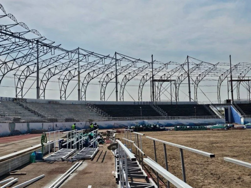 Трибуналарни ёпиш: Томошабинлар учун ҳар қандай об-ҳаво шароитида қулайлик яратиш мақсадида металл конструкцияли ёпқичлар ўрнатилмоқда. Бу томошабинлар оқимининг барқарорлигини таъминлайди.